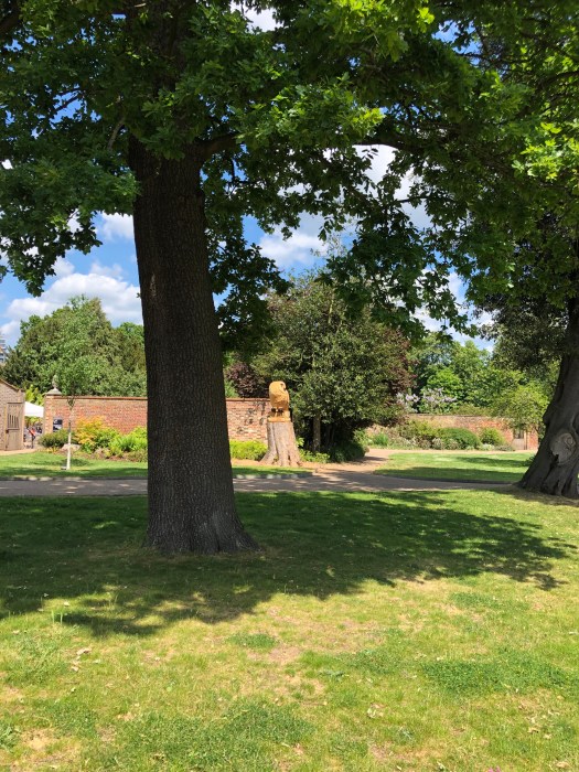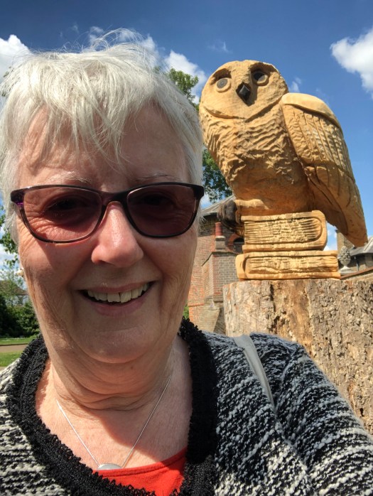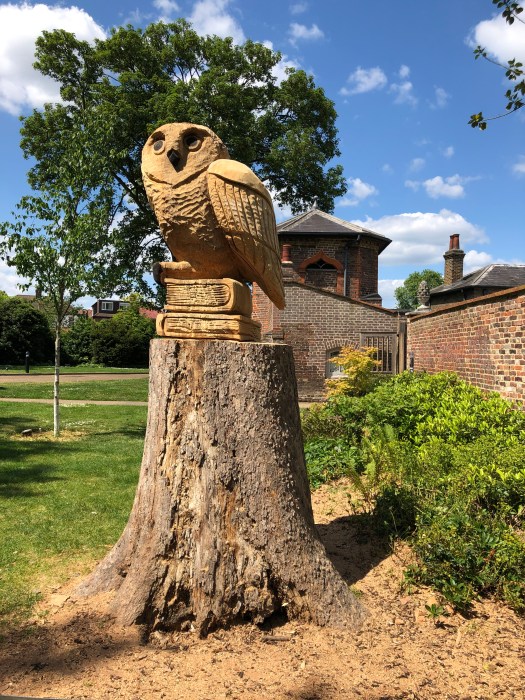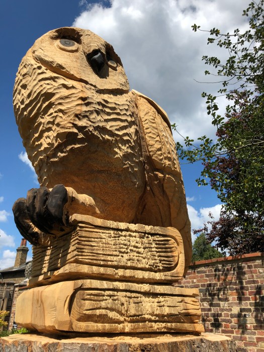 Well, first it was just a rather tall tree stump, which several of us thought was a (sadly) dead tree, being dealt with gradually by the tree surgeons so as to protect the walls of the Historic Gardens; then one day a man with a van and a chainsaw appeared to work his magic… and slowly over a period of a few days the unmistakable shape of Owl emerged, perching on top of two large tomes. We understand there is more to come… we will have to keep an eagle eye (!) on the Mansion’s website and blog. But for now, here are some pictures of the Friends’ coffee morning today and a closer inspection of our new feathered friend.