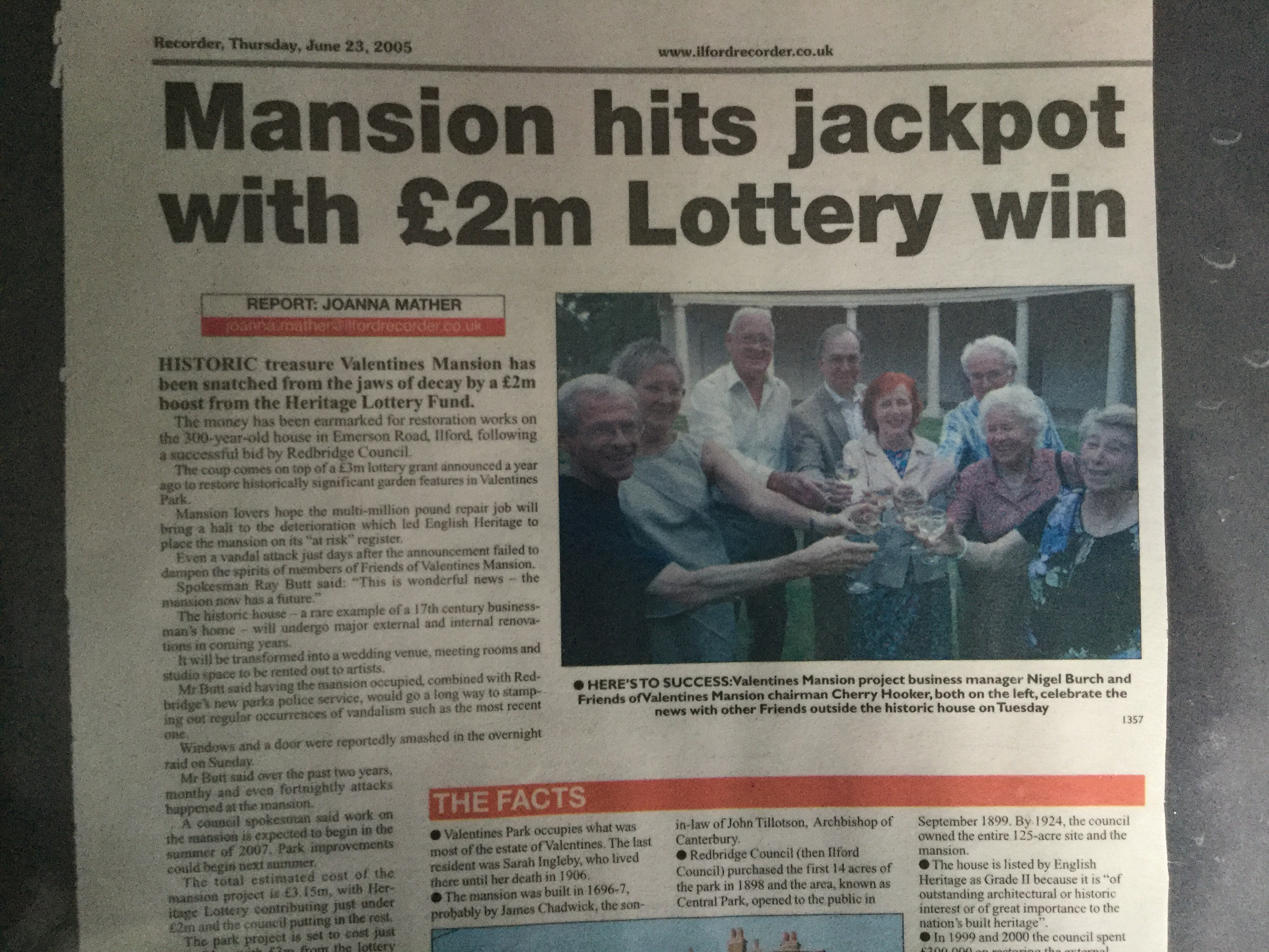 We are currently writing up the history of how the restoration of this mansion and gardens was achieved by the local community, represented by the Cranbrook Residents’ Association, Friends of Valentines Mansion, the Valentines Mansion Trust, the Valentines Park Conservationists and Redbridge Council with a successful bid for Heritage Lottery funding. The Conservationists were formed in 1999 and Friends of Valentines Mansion soon afterwards in 2000.