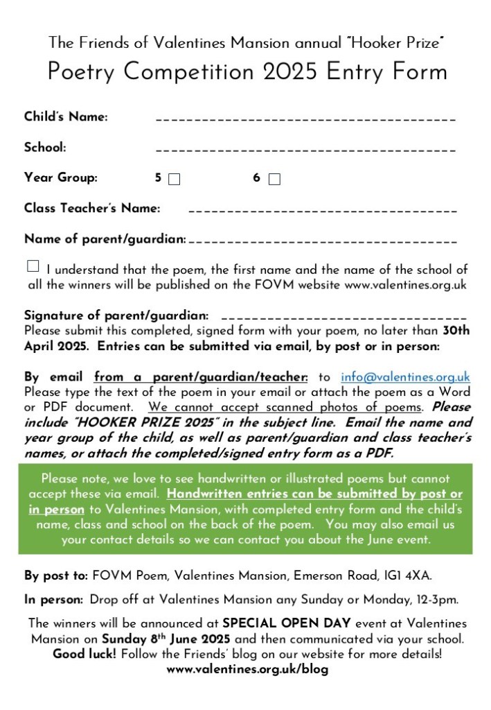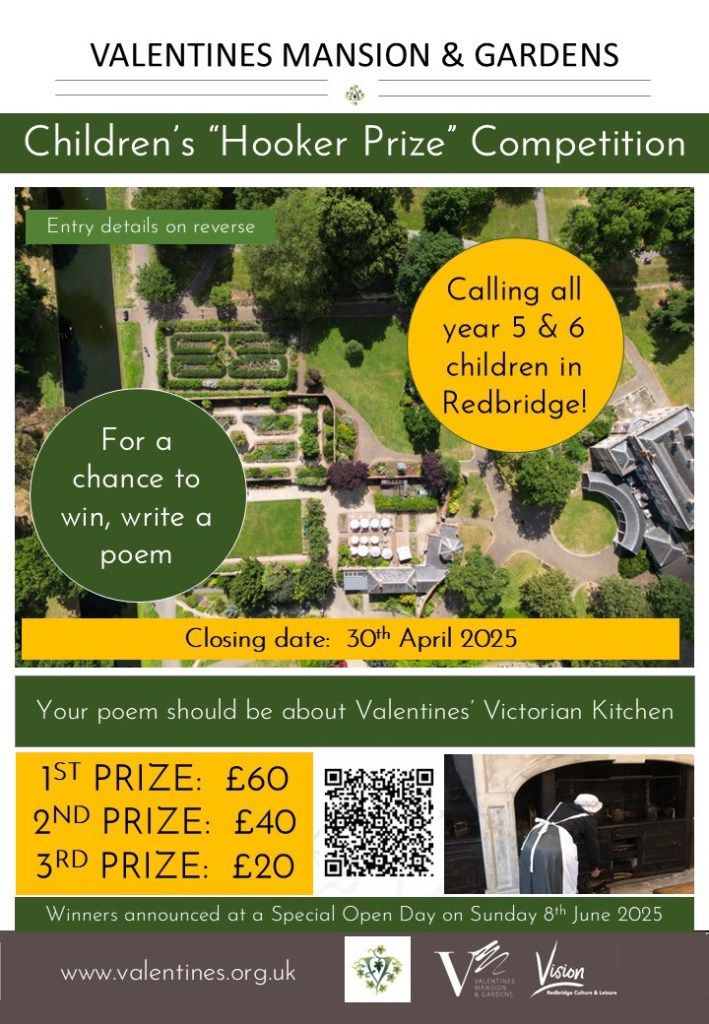 If you’re aged 7+, we are running a poetry workshop at half term. You can book here. £2 per child. If you are in Year 5 or 6 and live or go to school in Redbridge, you can enter our Hooker Prize Poetry Competition! Details below.