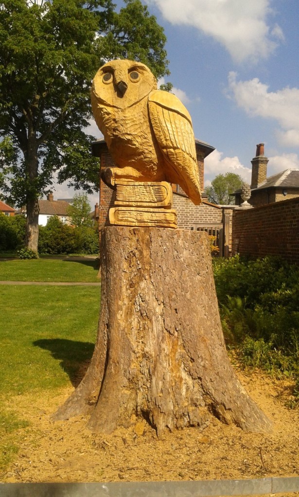 In December, a week before Christmas, one of the Friends’ members alerted us that the wooden owl, which was carved from the trunk of one of the mature sycamore trees by the walled gardens, had suddenly been removed.